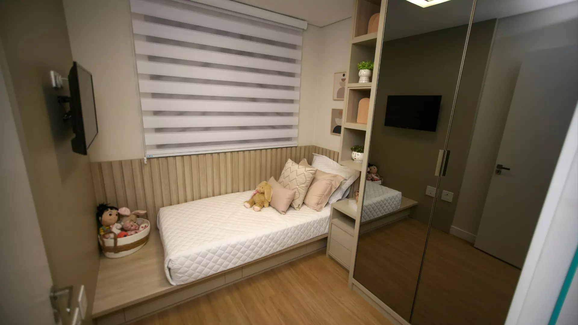 Ide dasarnya adalah menempatkan tempat tidur rendah atau kompak di dekat dinding dan menggunakan ruang yang tersisa untuk bergerak. Penting untuk menggunakan penyimpanan di bawah tempat tidur atau di dinding dan tidak meletakkan barang-barang di lantai. Menggunakan meja samping lipat atau kecil akan mencegah ruangan terasa sempit.