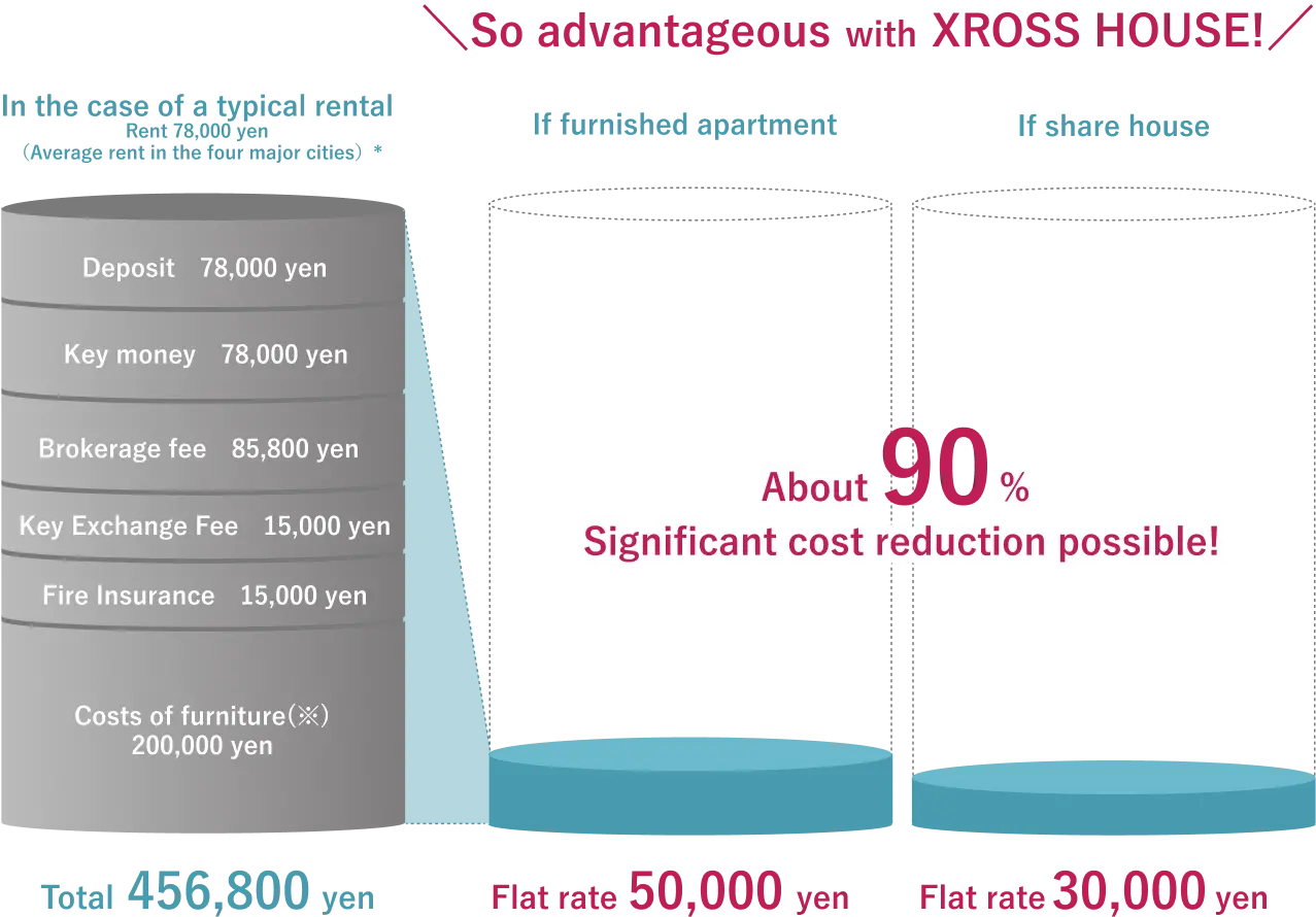Trong thuê nhà thông thường, tiền đặt cọc, key money và phí môi giới đều bằng một tháng tiền thuê, vì vậy nếu thực sự muốn giảm chi phí ban đầu, XROSS HOUSE share house và furnished apartment là lựa chọn tốt nhất.